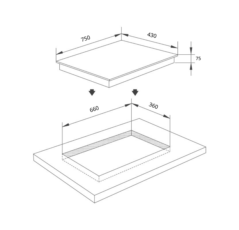 - Kích thước bếp: W750 x D430 x 75mm